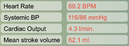 Under basic conditions (50 years old male, arterial acceleration off, no reflexes active) the heart pumps with a cardiac output of 4200 ml/min with a stroke volume of approximately 62ml at a heart rate of 69 BPM. Under dynamic circumstances the arterial compartment of the systemic circulation contains 620ml at a pressure of 116/86mmHg with the resistances from the last arterial capacitances to the venous compartment as most important determinants of arterial blood pressure.