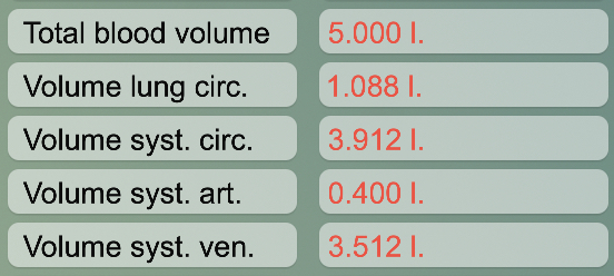 2. when there is no heart activity (and the pressure in all capacitances is equal and close to zero) blood will distribute with approximately 1000 ml in the small circulation versus 4000 ml (80%) in the systemic circulation. Of the 4000 ml in the systemic circulation the arterial capacitances hold approximately 400 ml (10%) with the rest of the blood held in the venous compartment (90%). These volumes can be checked when selecting cardiac arrest in the Scenario menu and bringing the window for immutable parameter values to the front: