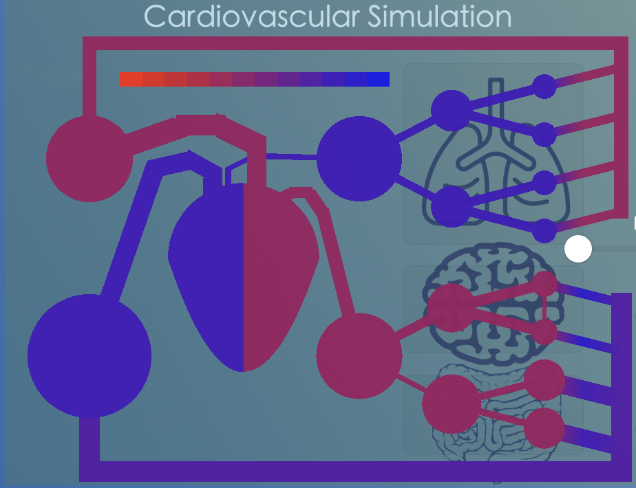 In the model we chose a single waste product called 'CO2' as simulated vector for chemoregulation. CO2 is produced in the tissues, transported by the blood to the lungs, where it is removed. For this, the model does a bookkeeping of the amount of CO2-molecules per volume in all the simulated capacitances. The concentration is graphically illustrated by changing the color of the model capacitances and resistances. In brief:
