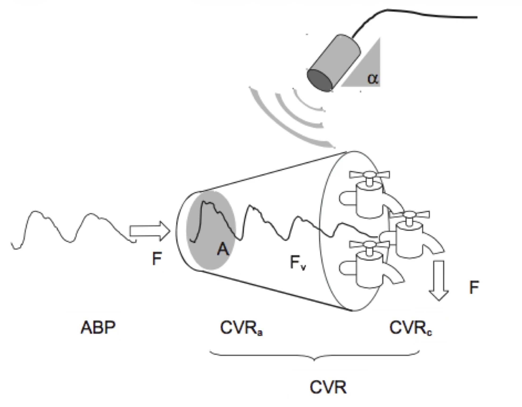 There was remarkably little agreement between both signals. What corresponded best was the heart rate and thus the duration of a single heart cycle. We defined the pulse flow velocity mismatch (PFVM) and later the pulsatile apparent resistance (PaR) as indices expressing the (dis)agreement between both signals. In 2004, the PaR was patented as a blood pressure corrected pulsatility index, since it expressed the difference between the apparent resistance (velocity/pressure) during end diastole and the 2nd systolic peak divided by the average apparent resistance. For quite some time we focused on the second peak in both signals since this correlated best with heart rate and CO2-reactivity.